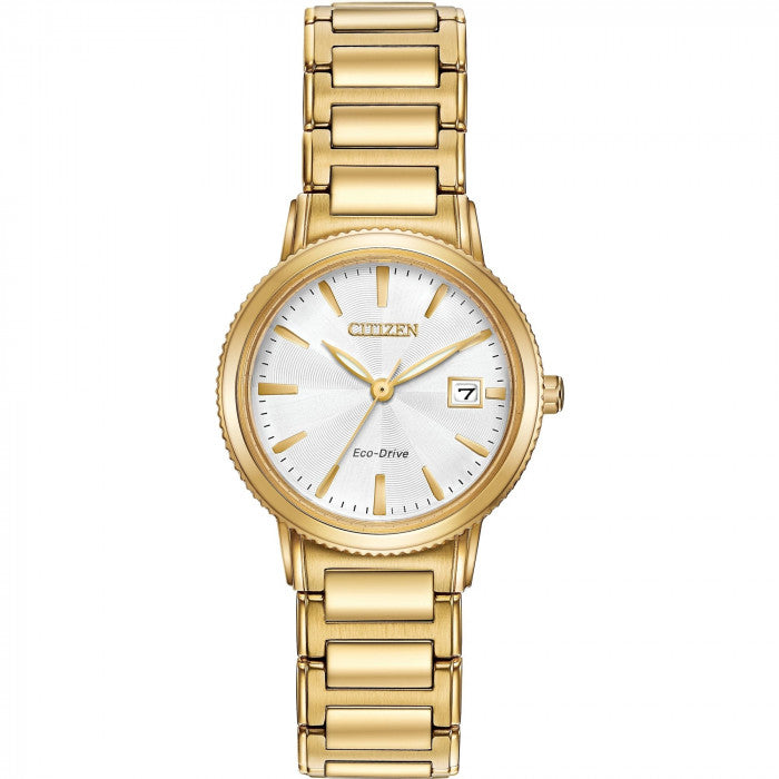 Citizen Sport WR100 EW2372-51A is an amazing and trendy Ladies watch. Material of the case is PVD Gold plated and the White dial gives the watch that unique look. The features of the watch include (among others) a date function. In regards to the water resistance, the watch has a water resistance of 100 metres. This makes it suitable for swimming, but not high impact water sports.