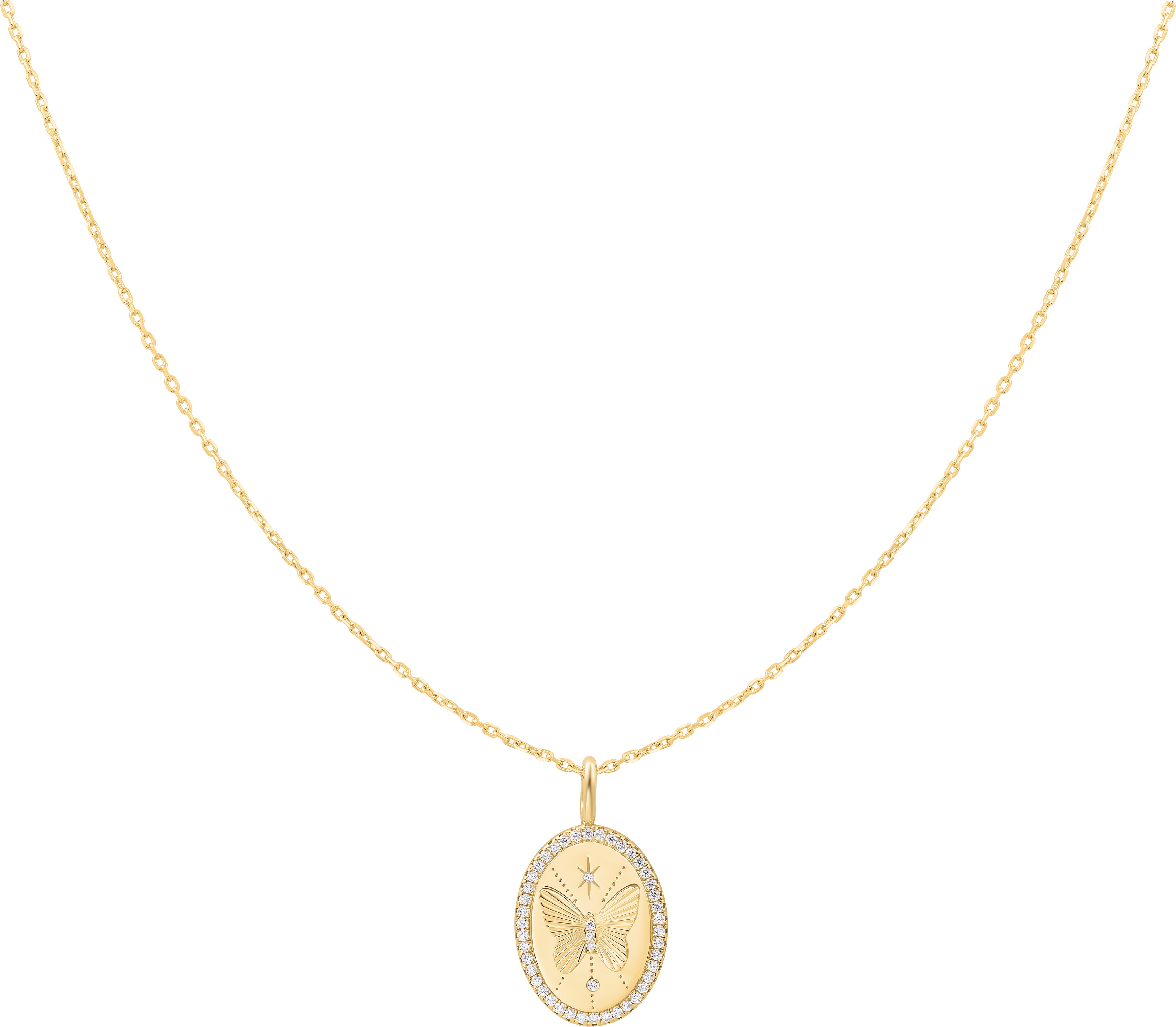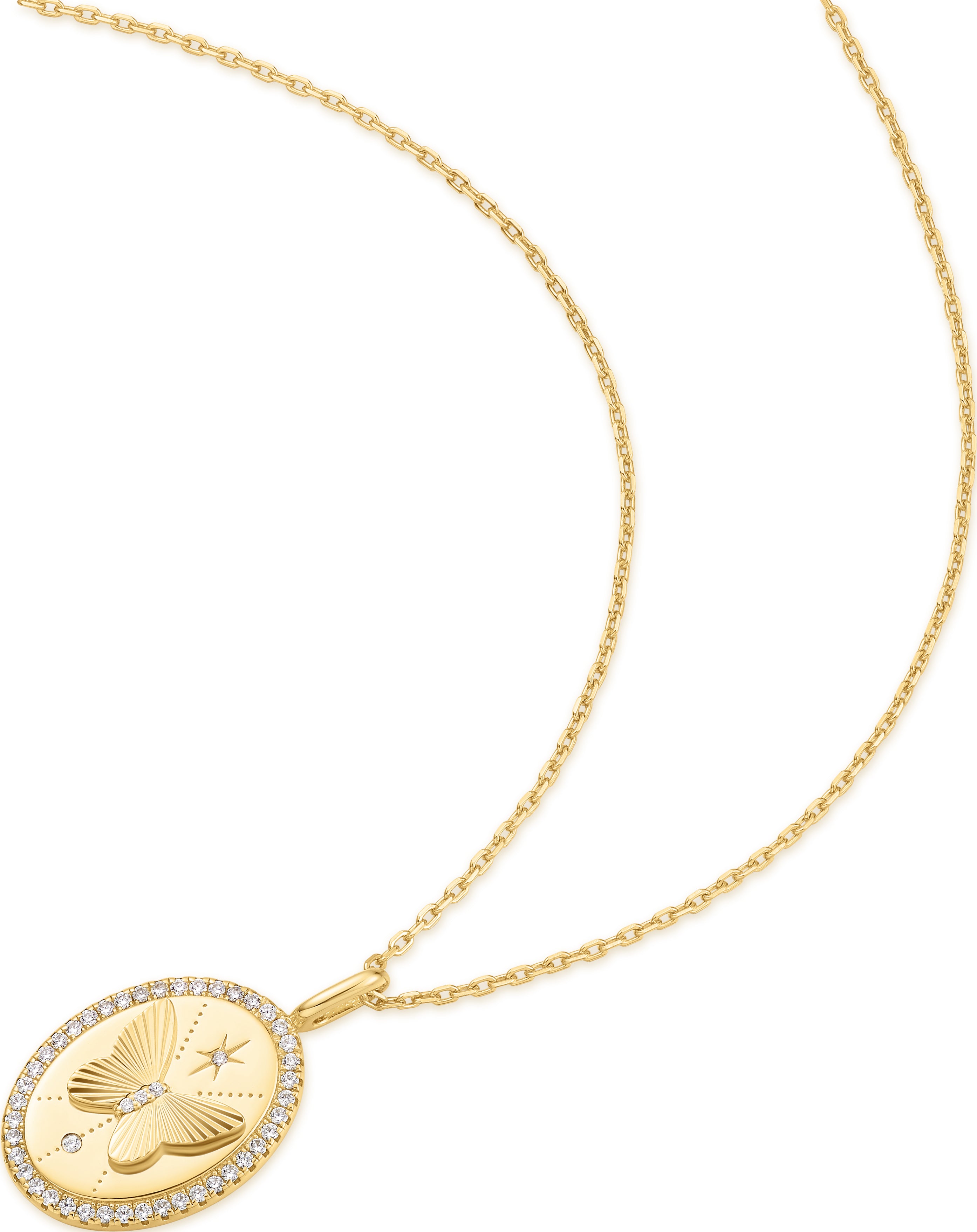 Embrace colour, light, and playful styling with Sunny Sparkler. Perfect for casual outings and relaxed days, this necklace features a engraved butterfly on an oval pendant, adding a dreamy and romantic touch. Layer it with other necklaces or wear it alone, making it ideal for both gifting and treating yourself.