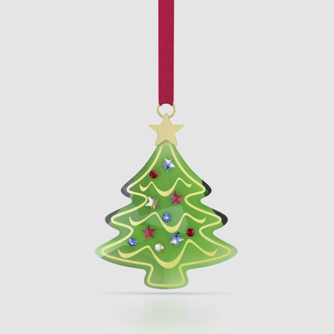 One of the iconic symbols of the holiday season, this ornament is crafted in the shape of a glittering festive tree. Suspended from a red grosgrain ribbon, the shimmering green design is crafted with 254 facets and features gold-tone print and decorations in red, blue, and Golden Shadow effect. At the top, the bright star is formed from champagne gold-tone metal. Hang this ornament in a prominent position and let it shine throughout your celebrations. Decoration object. Not a toy. Not suitable for children under 15.