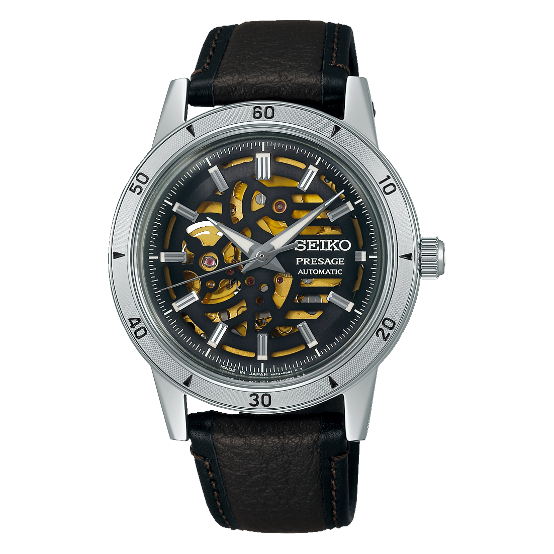 This Presage Style 60s is inspired by Sixties biker looks with a cutout dial pattern resembling a vintage motorcycle engine and its inner workings.