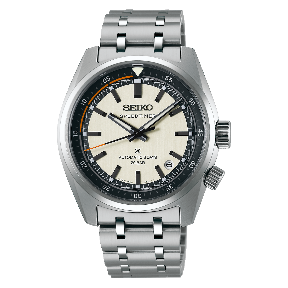 With its super-hard coating, the flowing case shape of this model was first used in 1972 on the famous Seiko ‘Panda.’ Under the curved sapphire glass, a silver-white dial is encircled by a countdown timer function. The strong Lumibrite coating on the inner-ring reference triangle allows for the countdown timer to be used with clarity during both day and night. Compact and comfortable, this Speedtimer has a diameter of 39.5mm, and a water resistance of 200m.
