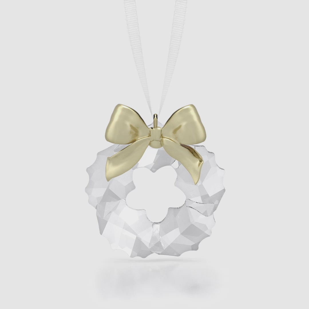 This luxurious wreath ornament provides a timeless symbol of festive elegance. Suspended from a white grosgrain ribbon, the crystallized design features 108 light-reflecting facets, along with a glossy bow in champagne gold-tone metal. Hang it somewhere prominent to evoke feelings of joy and celebration. Decoration object. Not a toy. Not suitable for children under 15.